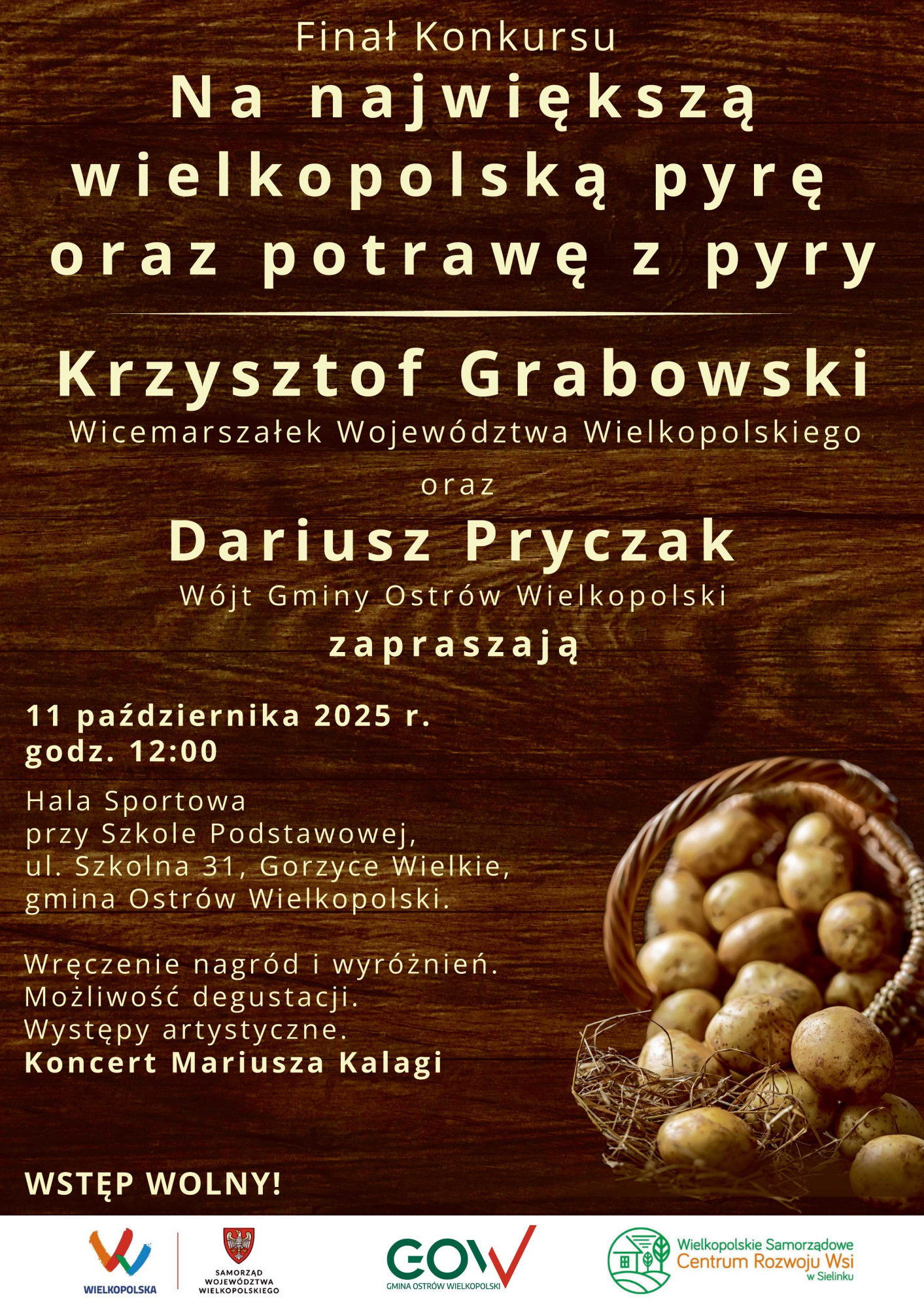 Samorząd Województwa Wielkopolskiego już po raz kolejny organizuje finał Konkursu „Na największą wielkopolską pyrę oraz potrawę z pyry”. Tym razem ziemniaczaną stolicą Wielkopolski staną się Gorzyce Wielkie w gminie Ostrów Wielkopolski, gdzie 11 października w Hali Sportowej przy Szkole Podstawowej przy ul. Szkolnej 31 odbędzie się degustacja potraw oraz oficjalne ważenie pyr gigantów.