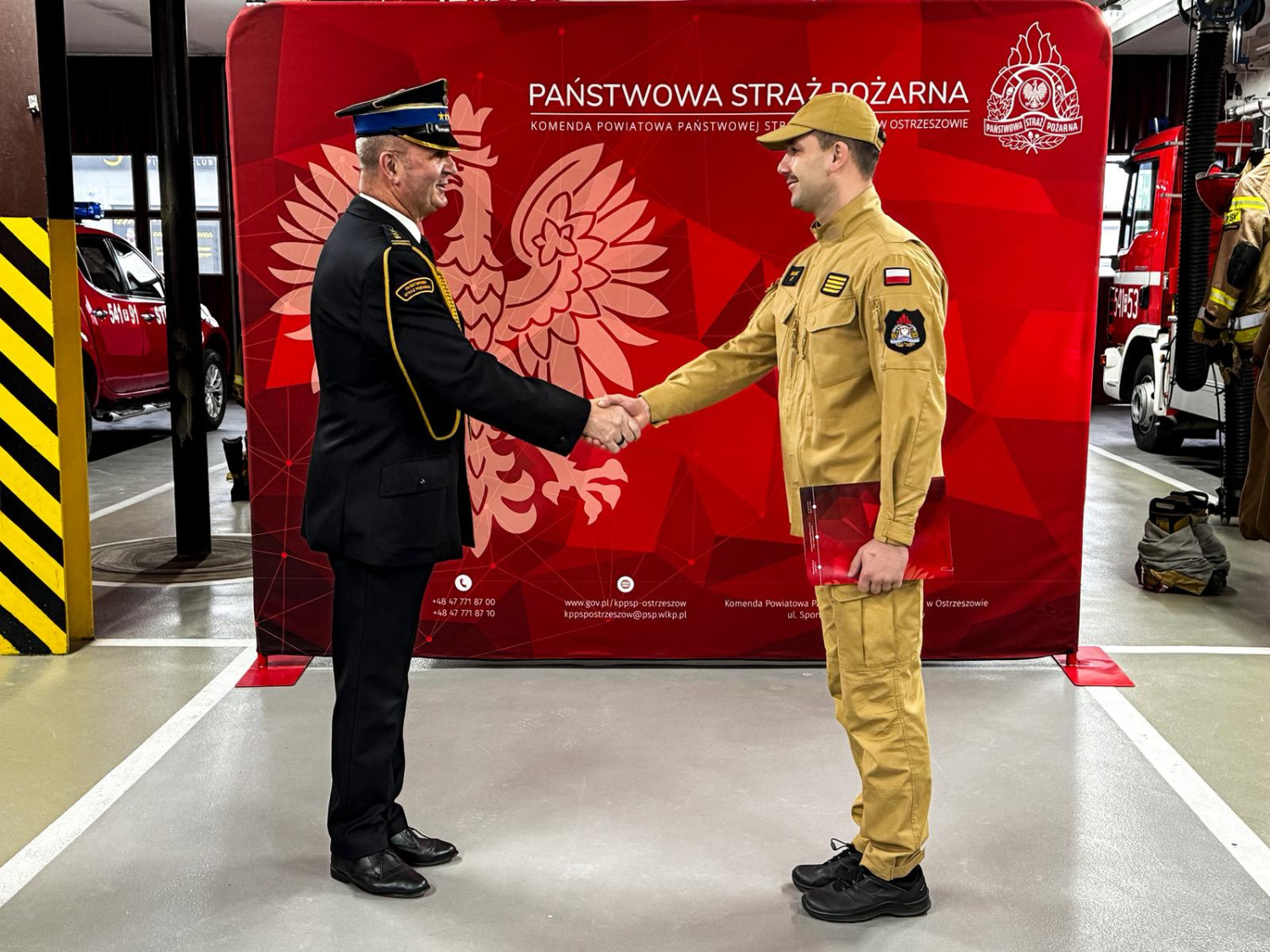 25 listopada 2025 roku w Komendzie Powiatowej Państwowej Straży Pożarnej w Ostrzeszowie odbyła się uroczysta zmiana służby, którą rozpoczął Komendant Powiatowy st. bryg. Piotr Mazurkiewicz. Wręczono funkcjonariuszom awanse na wyższe stopnie służbowe oraz nagrody Wielkopolskiego Komendanta Wojewódzkiego.