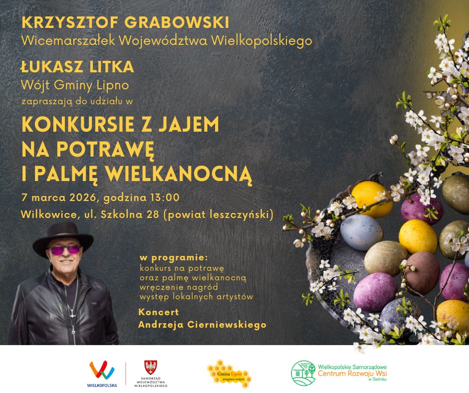 Wicemarszałek Województwa Wielkopolskiego Krzysztof Grabowski oraz Wójt Gminy Lipno Łukasz Litka zapraszają mieszkańców regionu do udziału w wyjątkowym wydarzeniu - Konkursie z Jajem na Potrawę i Palmę Wielkanocną, który odbędzie się 7 marca 2026 rokuo godzinie 13:00 w Hali Sportowej przy ul. Szkolnej 28 w Wilkowicach (powiat leszczyński).