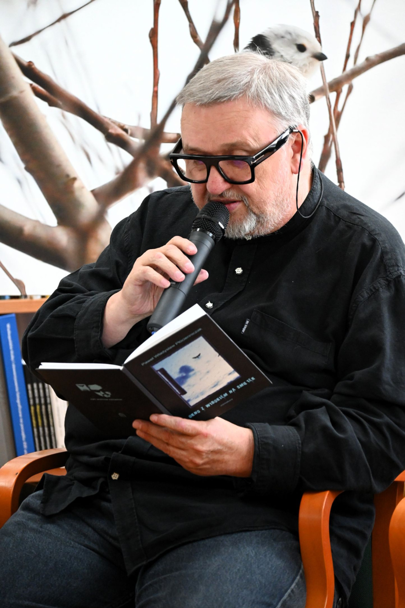 Podczas wieczoru mieliśmy okazję zapoznać się z niezwykłą twórczością naszego gościa, który nie tylko czytał swoje wiersze i aforyzmy, ale również dzielił się inspiracjami, osobistymi przemyśleniami i opowieściami o ptakach – stworzeniach, które od lat odgrywają istotną rolę w jego życiu.