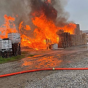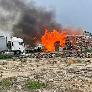 Przybyłe na miejsce zdarzenia jednostki ochrony przeciwpożarowej ustaliły, że pożarem objęty został skład drewnianych palet na powierzchni około 600m2, które znajdowały się w pobliżu samochodów ciężarowych oraz budynków mieszkalnych.