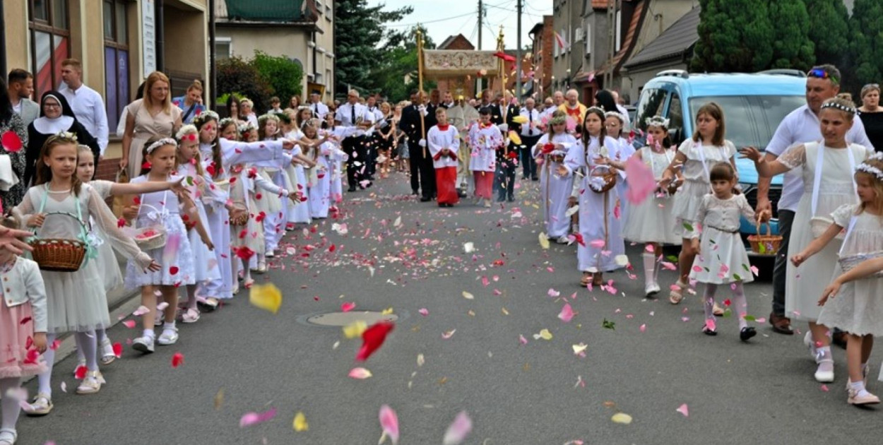 Po Mszy Świętej wraz z Jezusem ukrytym pod postacią Chleba wyruszyliśmy w procesji do czterech ołtarzy. Krzyż, chorągwie, feretrony, poduszki z emblematami religijnymi niesione przez dzieci poprzedzały w procesji Jezusa ukrytego pod postacią Chleba niesionego w monstrancji. Tuż przed kapłanem niosącym monstrancje szły dziewczynki sypiące kwiatki. Pięknie przygotowane zostały ołtarze.
