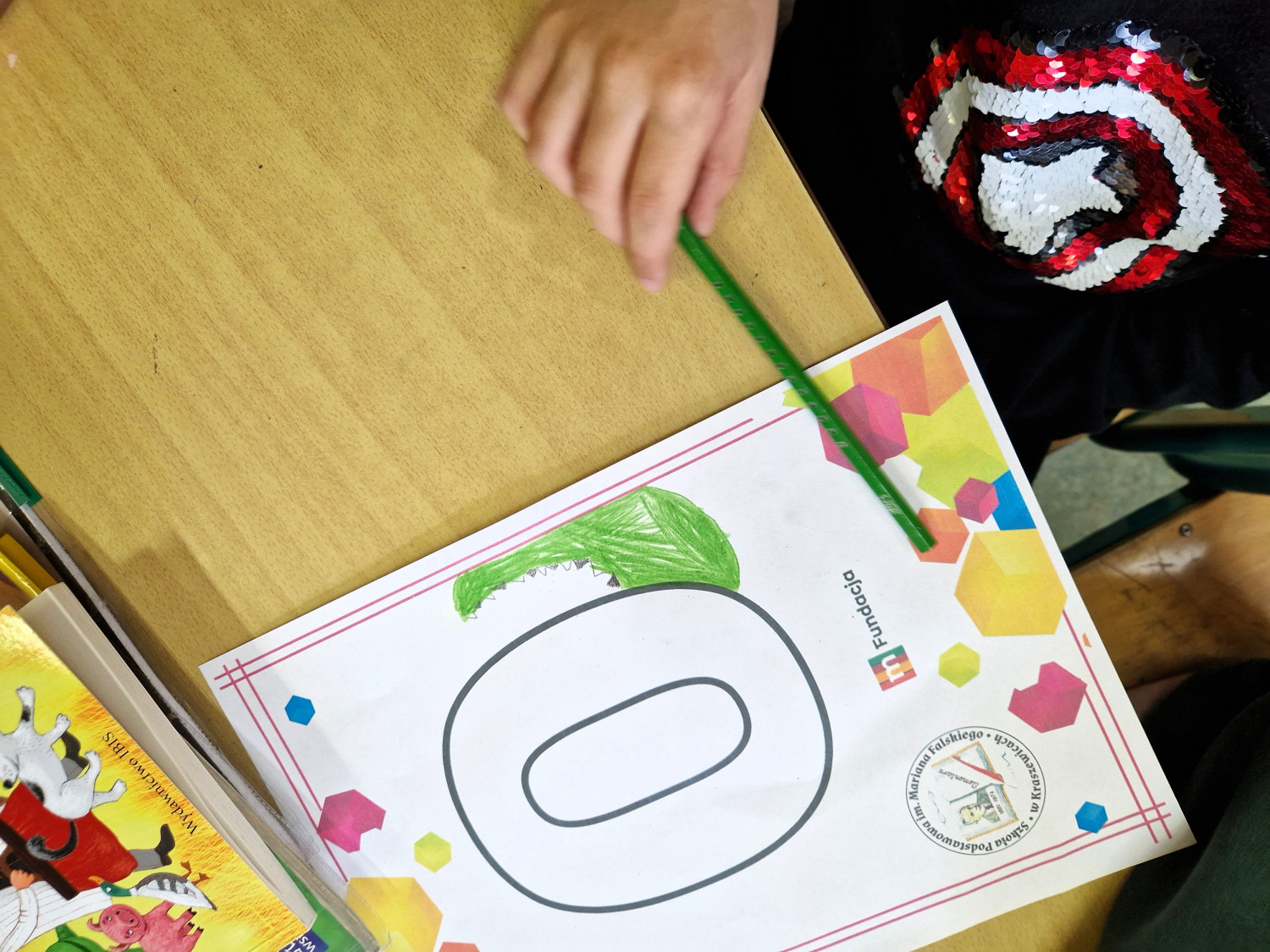 W drugiej części zajęć dzieci otrzymały duże kontury cyfry 0 i miały za zadanie twórczo je ozdobić. Po kilku minutach powstały prawdziwe dzieła sztuki, które trafią na szkolny konkurs „Matematyka w plastyce”.
